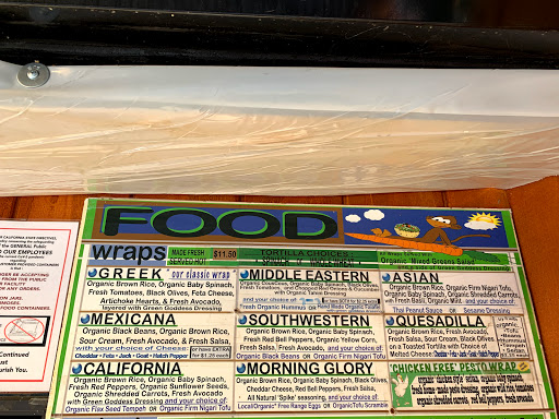 they have the best tasting, healthiest food and mostly organic... the organic wraps are not only to die for - theyre HUGE (one will feed two people)... my personal favorite however is the Darrells Salad - with crumbled up falafel balls on top of organic greens topped with Tahini dressing and the notorious Green Goddess Dressing... also organic teas, coffee, expresso, and so many different juice combos and smoothies you wont be able to choose... they actually know how to do REAL foam (from organic milk) for dry cappuccinos...