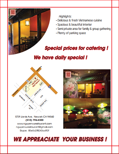 Outstanding place to eat! Its clean, there is good customer service, and the prices are reasonable!! I love going to Nguyens Vu!!!