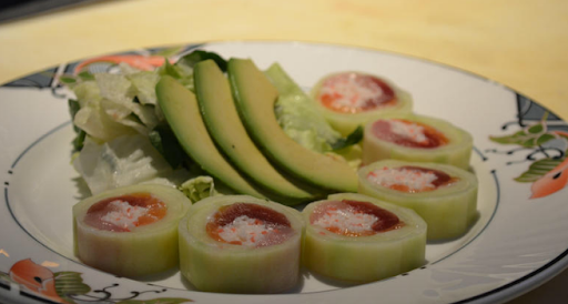 Delicious sushi, crab meat asparagus soup, and salmon asparagus fried rice.