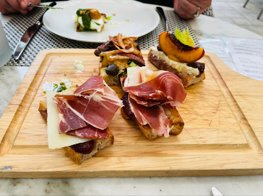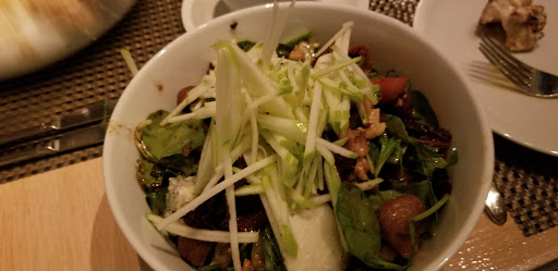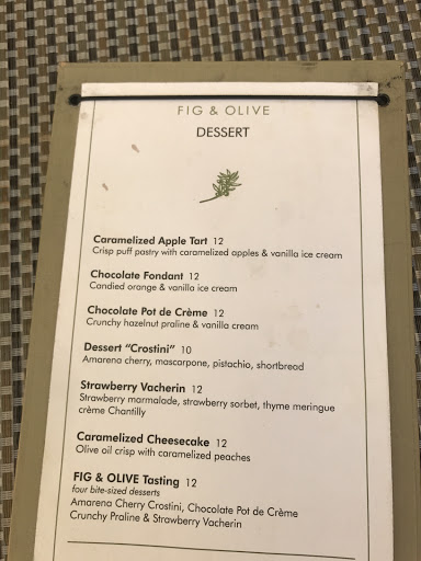 Burrata, Tomato, Pesto, Balsamic Crostini (Mix and match - 3 for $12, 6 for $21) is creamy from the velvety smooth burrata, herbaceous from the pesto and microgreens, and sweet and tangy from the balsamic and tomato. Rating: 5/5 Manchego, Fig, Marcona Almond Crostini (Mix and match - 3 for $12, 6 for $21) is simplicity at its best. Even though it is simple, it is rich and powerful in flavor from the nutty manchego to the sweet fig. Rating: 4/5 Shrimp, Avocado, Cilantro, and Tomato Crostini (Mix and match - 3 for $12, 6 for $21) has a perfectly cooked shrimp with a nice snap. With an almost Latin flair, the ingredients work well together from the creamy avocado to the sweet tomato to the refreshing cilantro. Rating: 4.5/5 Octopus, Hummus, Pimenton Crostini (Mix and match - 3 for $12, 6 for $21) is lovingly topped with tender, thinly sliced octopus. The hummus adds a creamy flavor for a Mediterranean flair. Rating: 5/5 Pata Negra, Smoked Tomato Concasse Crostini (Mix and match - 3 for $12, 6 for $21) has a Spanish tapas influence. Pata negra (also known as jamón ibérico) is a cured ham produced in Spain and Portugal from black Iberian pigs or cross-bred pigs that are at least 50% Iberian. The cured flavor of the pata negra pairs well with the smoky, rough chopped tomato. Rating: 4.8/5 Crab Salad ($15) combines jumbo lump crab, celery, celeriac, snow pea, green apple, lime, cilantro, scallion, horseradish mayo, and pink pepper. This salad is a clean, refreshing way to start any dinner. The vegetables and green apple add a crisp texture to the moist, tender crab meat. Great dish for spring! Rating: 4/5 Paella Del Mar ($32) includes black tiger shrimp, sea scallop, calamari, mussels, saffron rice, green pea, red bell pepper, artichoke, saffron aioli, pimenton, and oregano. The saffron rice is creamy like risotto. All of the seafood components are cooked to perfection – the shrimp has a nice snap, the calamari is tender, the scallops are nicely seared, and the mussels are succulent. The peas, bell pepper, and artichoke help tie everything together with a nice fresh flavor. Rating: 5/5 Rosemary Lamb Chops ($39) are grilled, smoked à la minute with a bouquet of Herbs de Provence, goat cheese & chive gnocchi, braised eggplant with honey, thyme, and rosemary garlic olive oil. The presentation is lovely with smoky dome. Using a bit of artistic flair, the server removes dome in a swirling motion so the smoke spirals up into the air. Then, they top it with an olive oil drizzle. The lamb has a Mediterranean flavor profile from the rosemary, garlic, and olive oil. The goat cheese gnocchi are a nice creamy, starchy surprise. Rating: 4.5/5 Caramelized Apple Tart ($12) is a crisp puff pastry with caramelized apples and topped with vanilla ice cream. It is a very light dessert, reminiscent of something you would pick up for breakfast at a French bakery along with an espresso. The vanilla ice cream makes it a bit more decadent with its creamy flavor and texture. Rating: 4/5 Chocolate Fondant ($12) is flavored with candied orange and topped with vanilla ice cream. This dessert is like a marriage of a chocolate lava cake and soufflé. It has a slight chocolate lava-like center, but is light like a soufflé. The vanilla ice cream acts like a crème anglais as it starts to melt into the nooks and crannies of this cake. Rating: 5/5
