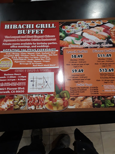 Another day, another buffet.... But, not just any ordinary day, Thanksgiving Day! This Thanksgiving was the first in awhile where we didnt have a free turkey. Im not that big on turkey to begin with, so what more reason do I need than to hit up an Asian buffet. Hibachi Grill Buffet opened for business a few weeks ago. I received a flyer in the mail and decided to to celebrate the Harvest Festival (Thanksgiving) here. It is located at Norwalk Square, adjacent to the 99 Cent Only store. A lil ghetto, but reasonable. I called a couple of days before, asking if they were serving dinner all day for Thanksgiving. They said yes, so I was expecting the dinner selections. When we got there, they were serving only the lunch selections, which was a bummer, but we did save money because we paid the lunch price. Heres the breakdown (lunch)- Dining area-The dining room was clean & tidy. There is plenty of available seating & a private banquet room for large parties. I believe there are 2 flatscreen TVs to watch the game or whatever else that is on at the time. There are both booths & chairs for diners to park at. Hibachi grill- The grill area had the typical selections youd find at Great Khans in the mall. Bean sprouts, broccoli, onions, mushrooms etc. The meat selections were shrimp, beef, pork & chicken. I made sure to add heaps of minced garlic to my order because Im a garlic fanatic. Like BK, have it your way. There is also a crepe station on the left. I had a banana/strawberry/mango crepe drizzled with chocolate/strawberry syrup and a dusting of powdered sugar. Sweet! Sushi- The sushi bar had the usual California roll variants, along with tuna rolls, cream cheese rolls, veggie rolls and others. I mostly ate the California rolls with the roe on the outside. I was hoping for nigiri, but I think its just for dinner. The quality was decent for a buffet. Hot foods- When dining at Asian buffets, I opt for the seafood selections. I piled on the clams and shrimp cocktail and had my way with them. For soup, I had the egg flower soup, which was tasty & went well with the cold weather. There is a plastic container with green onions inside so patrons can add as much of them as they want, which is a nice touch. I asked if crab was available, but that is also only for dinner. Blue crab, specifically. Dessert- For dessert, there were a variety of fruits available - cantaloupe, honeydew, grapes, strawberries, watermelon etc. Also available were various cakes, almond cookies, macaroons and other items. Of course, the ever present powdered ice cream machine beckons all who walk by it. I helped myself to a bowl or 3 before leaving, adding chopped peanuts & semisweet chocolate chips. Great way to cap off lunch. Overall, I found Hibachi Grill Buffet to be a quality, affordable buffet. $6.99 for lunch/Mon-Sat is a great deal. Seniors get 10%, too. Ill have to dine here for dinner to truly experience what Hibachi Grill buffet has to offer. But for lunch, its cheap & good. Recommend! NOMNOMNOMNOM