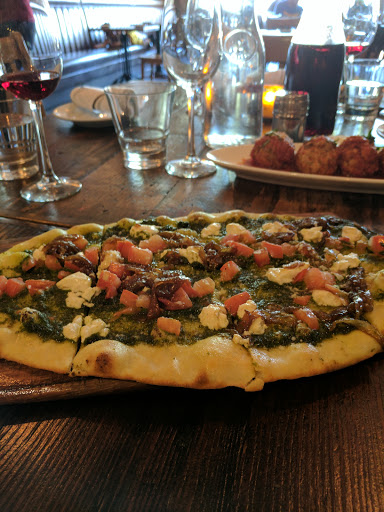 Amazing flat bread pizza, fantastic cocktails. Airy atmosphere perfect for a warm afternoon, heat lamps out front for when its cold. Staff is super friendly and attentive.