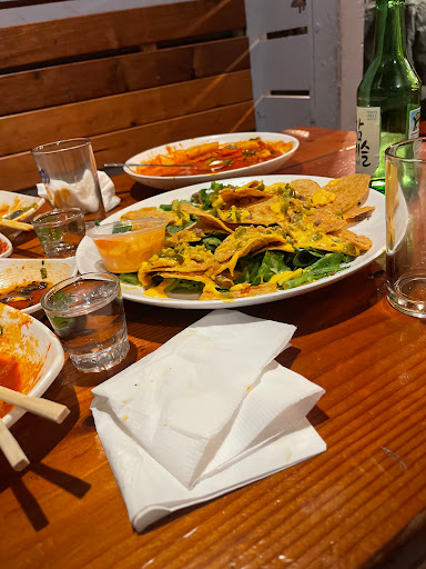 I love this place! It took forever for Google to change the name to the right place, but finally its done. For locals, this place is known as P0rno Bar (or Palace), a reminder of what used to be on the walls back in the day, before the newer movie posters went up. The Korean bar food here is the best. Definitely get the fried chicken, along with the spicy rice cake with ramen, and the corn cheese. Yes. Corn Cheese. Dont forget the strawberry soju too.