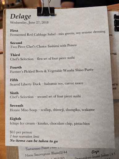 Delage is so good its almost infuriating. How can the food be so good at such a low price point (for omakase at this level, anyway; $65 is still a decent amount to throw down for one meal)?! Im still not sure, but go for the stellar sushi and the fun, more Western-leaning elements of your course meal. When I went I was pleasantly surprised by some of the nigiri Ive never had before (blueback sprat and barracuda, for instance). The least successful dish in my mind was the pork tenderloin (though in general Im not a huge fan of lean pork), but even that dish had an interesting pairing of a mushroom sauce and a cranberry-apple puree. I do wish Delage wouldnt serve the seriously overfished bluefin, though. But damn was that chutoro good.