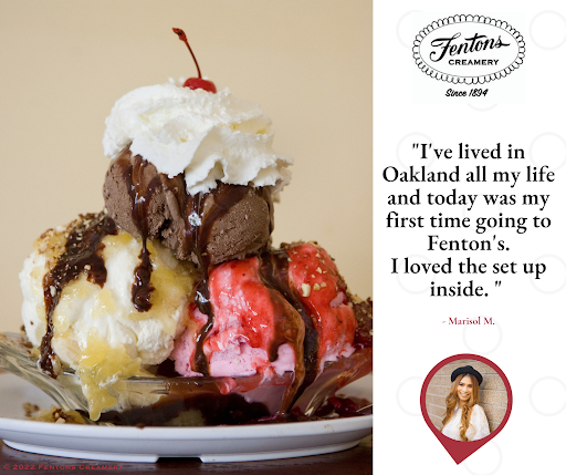 Perfect for all your all-day or late-night sweet tooth cravings! Great for group outings and celebrations. You definitely get that family-owned feel. Just want a scoop (or why not two) of your favorite flavor? Dont be intimidated by the perpetually long line pouring out of the front double doors. The uber-friendly staff keeps the line moving fast and people going in and out quickly with their decadent desires? Or maybe you want something to eat or a more adventurous treat? You and your group can take a seat and order from a variety of parlor foods and treats, from classic burgers to shakes and pies. Of course, the main attractions are the MASSIVE sundaes that Fentons is famous for. My friends and I were feeling quite adventurous and celebratory (it was one of their birthdays), so we split a Banana Special, the featured sundae on the menu. When they say "three HUGE scoops of ice cream", its really an understatement. What we got looked more like three whole pints really, all over a sweet, ripe banana and topped off with strawberry jam, chocolate, pineapple, whipped cream, and a cherry. It was outright delicious and filling, and Im sure glad we had a team to finish it.