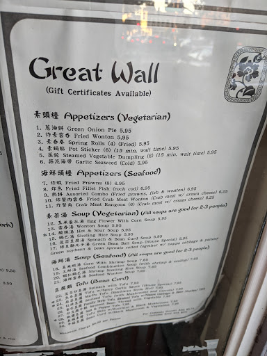 Great wall is awesome. Reasonably priced and lots of options for fake meat living vegetarians.