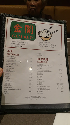 Ive had Gum Kuo on my list for quite a while and happy to have finally tried it today with my habibi :) We came in at about 2pm on a Tuesday and place was pretty full - not too shabby! Only locals eat here so be ready to eat with chop sticks ;) Their menu includes pretty much any choice you could ever want starting from soups, their versin of porridge, rice and noodle plates, main entrees, apetizers, egg dishes, sandwiches, any type of meat [chicken, pork, duck, beef etc] and plenty of seafood options. What doesnt it have really? Prices are ah-ma-zzz-ing! So many great choices for under $10? WHOA! Dont miss their lunch specials for 7.5$ until 2:30pm!!! Between the two of us we [over]ordered: - beef mushroom rice roll - bbq pork rice roll - chicken fried rice - salt and pepper shrimp Gotta love their delicious rice rolls - just like the typical cheung fun but more rice rolls than usual and lots of meat stuffed inside. If youre ordering a main entre, 1 of these bad boys is more than enough if its just two people sharing. My hubby preferred the beef and i loved the bbq pork :). Fried rice was delicious, not too oily and had that old school smoky flavor - it went well with their chilli sauce. Salt and pepper shrimp was good and fresh but just like plain dry shrimp dish it just didnt go with what we were eating - hubbys fault :P Overall, service was fast and friendly, place is neat, food is delicious and prices are unbeatable. Highly recommend. Dying to come on a cold day to try their porridge :) PS. They accept card payments for bills over 20$. No bathroom inside.