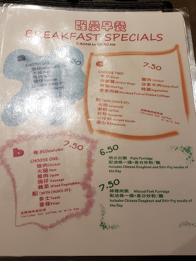 Good jook/porridge here. Its the thicker kind, very flavorful. They have a big selection here, ranging from "really chinese" (e.g. innards), to "american chinese" (e.g. mongolian beef), to HK style bistro. The roast pork and cha-siu are good here.