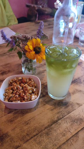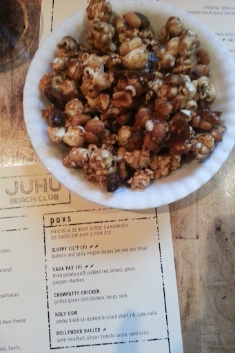 Tonight my BFF and I dined at _Top Chef_ alum Preeti Mistrys Mumbain-inspired restaurant, Juhu Beach Club. The location was formerly a new American restaurant in gothic red and black so when we stepped inside I was taken aback by the retro pink wallpaper. The plates and glassware looked mimicked disposables, as if you were at a picnic. I was blown away by the cilantro lemonade spiced with cumin -- it sounds like an odd combo but it was savory and refreshing at the same time. We had the Desi Jacks -- like Crackerjacks except with pistachios and Indian spices that packed heat. The sweet corn and gypsy pepper side was actually one of my favorite dishes, as was the special starter, a peach chutney with toast and salad. The vada pav was disappointing (the soft texture of the chickpea meshed with the soft bread, had there been crunch, it would have been delightful). The salad with puffed rice and garbanzo beans and peanuts was also very good. What I liked overall was that the food was light and seasoned very well without feeling heavy. Service was pretty attentive.