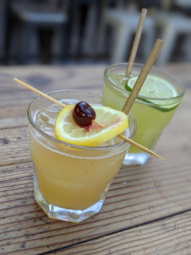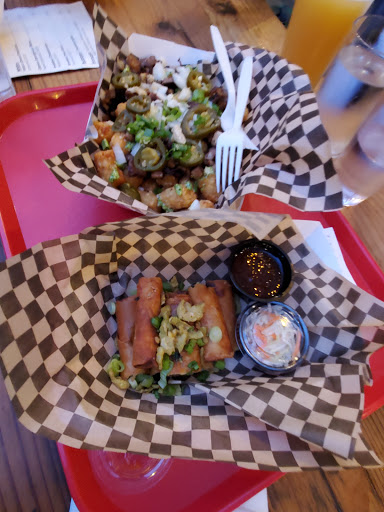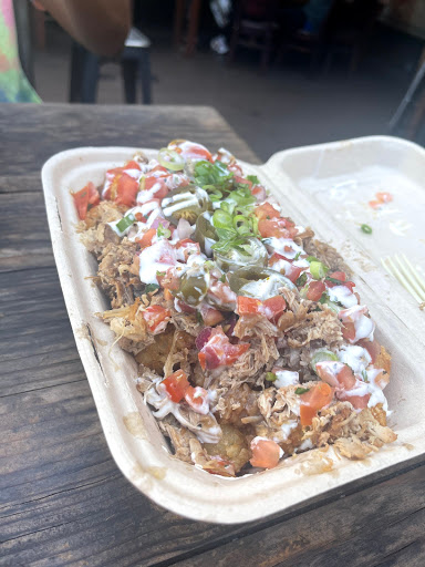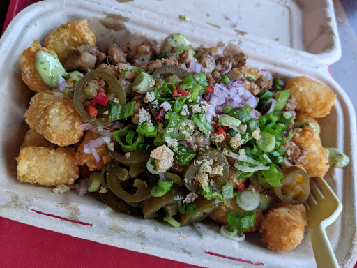 Yummy pop-up LA street food outfit tucked into the corner by the bathrooms on the left of the bar (bacon jam fries!). Cool rooftop bar area too with tvs tuned to sports (just bring a jacket), cornhole, etc. Brought to you by the fellows that did Berkeleys Shattuck Down Low I believe.