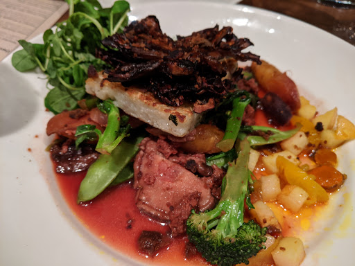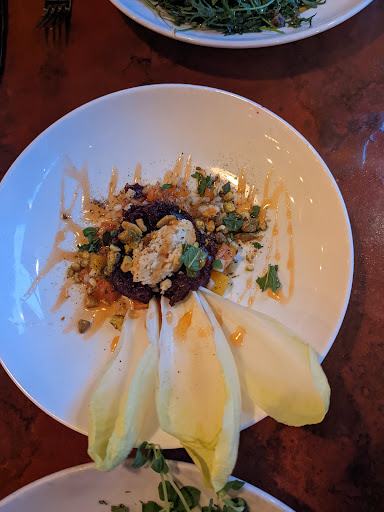 My spouse is (mostly) vegan, so for our anniversary, it was between Greens and Millennium. Over the years, many carnivore friends had spoken so highly of both that we were excited. I also heard that Millennium tended to be more creative so that folks missed the meat less. I would give it a 3.5 if Yelp would allow, but... 1. Food: we ordered two apps (Mirin Glazed Sesame Onigiri and Black Bean Torte), but our waiter brought a third (Seared Potato Gnocchi) over which we had been torn (complimentary - very cool of him). The torte is very good - the other reviews are accurate (good, not religious), the Onigiri was tasty (sauce was required - otherwise not special), and the Gnocchi was actually pretty bland (it was our waiters favorite - he described it as "subtle" (again, read: bland)). For entrees, we had the Brik Pastry Roulade and Red Quinoa & Fresh Corn Tamale - both were "OK". Dessert was pretty good, and impressive that there was no dairy (could have fooled me). Overall, the apps were the best, and unfortunately, the food didnt blow us away. Good, but not matching the reputation. 2. People: very polite. The woman who seated us seemed genuinely warm, and our waiter and bus guys were all very polite and helpful. The team is the main reason Id go above three stars. 3. Location/Ambiance: a big "meh" - probably the most significant disappointment. Not the greatest neighborhood, which is fine, but its attached to a B/C-grade hotel, which doesnt set the greatest tone when you first arrive. Our area of tables were in the "New York"-style section: two tops like sardine cans line the long wall. Not a favorite - you either make friends with the people flanking you, or you try and ignore their conversation, parts of which you inevitably hear. 4. Other: largest section of post scripts/notes on a menu that Ive seen (e.g., sustainability, etc.), plus opportunity to give to local charity - pretty cool. Overall: good food (not amazing), didnt miss the meat that evening, good staff/team, not much on ambiance - going to try Greens next.