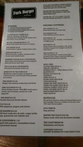 Theres nothing more comforting than moving into a new neighborhood than finding out theres a burger joint just down the street. The only one thing that would make this better is that they serve one of the best burgers Ive had in a long time. Park Burger is this place. They have an epic menu that would satisfy all burger palates. My go-to burger is the Garibay: two strips of bacon and a fried egg. I get it with cheese and a side of... peanut butter. I asked for this my first night there, and they didnt blink when I asked for it. We actually had a good laugh about it at the time of ordering. Explained them to them it was my favorite condiment from a burger joint I went to in college (RIP, Minder Binders). My fiancé craves the portobello mushroom (burger?) sandwich. She says its the best shes ever had. I cant comment on this because, seriously, this is a burger joint. Im going in for that. Have I mentioned the shakes? Yes, the shake menu is excellent! Funny story, we got shakes one time, and it had a strong taste of coconut. We go back to tell em what happened, and the dude at the turns around, "Seriously, dude! Youre using the coconut ice cream!" We proceeded to bust chops. They made us new shakes with no hassle. Great customer service. All in all, I love this place. This place has it all. Excellent burgers. Excellent service. Excellent shakes. I cant wait to go back.... this week.