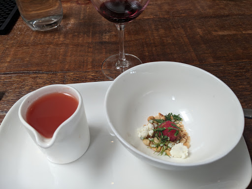 The trick is to come early during happy hours and order a drink with bar bites. Then order from regular dinner menu. Savings during HHs can be significant depending on what you get. I got in about fifteen past five wanting something light to tie me over. My waitress Angelica gave in on her own personal recommendations. I told her Im dining solo and didnt want a full dinner. Made my selection base on HH menu. Got charcuterie & cheese plate $12- and a cocktail made with fresh ginger $8. Everything that you need to make a mini snack toast is there from hard to soft cheese and thinly sliced salumi. Last, but not least the homemade mostarda is fabulous. I spread them evenly on crostini along with soft cheese. Absolutely a bargain for twelve bucks comparable to others nearby with a asking price of seventeen dollars or more. Cocktail was perfect for warm weather treatment. Lime juice, scotch and ginger made a world of a difference.