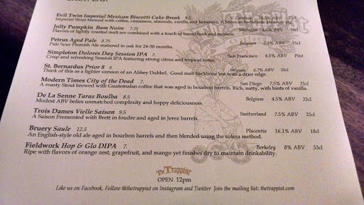 Heres why I love The Trappist: I can drink something other than an IPA. They have a great selection of Belgian, German, Czech, and other beers from around the world that arent just all about hops. They have light and dark, burnt and sour, citrus and chocolate, and everything in-between. The beer menu changes frequently, but I can always find something that I like, and usually something that surprises me, too. I really dont like the strong hopped-styles that are so popular and prevalent in the bay area, so places like The Trappist are a refuge for me. Low IBUs forever! The food is also surprisingly good. One of the best reubens Ive had. Dont count it out. Youll have a great lunch here.