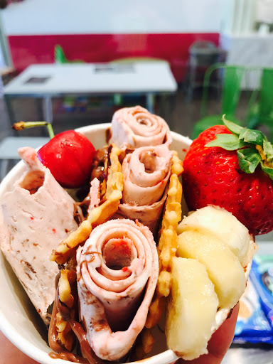 When we first walked in, the guy was making someones rolled ice cream. He finished, and we ordered. I ordered the strawberry cheesecake rolled ice cream, and hubby ordered the chocolate lava rolled ice cream. He made the chocolate lava, with a cupcake. We also asked for peanut butter in it, which he seemed to "forget". But, it was still really good. Topped with whipped cream, a Chocolate wafer, and crumbled cookies. Yum! At this point, people kept coming in. Before making mine, he rang up 3 different people, and made a smoothie. Apparently it isnt first come, first serve. My husbands ice cream was half eaten, then the rest melted, before he even got to making mine. That is why I gave 4 stars, instead of 5. That isnt the way you do things. Its too bad too. The kid was pretty nice. Anyway, so I finally get my ice cream, after about 20 minutes. The strawberry shortcake rolled ice cream was so good! With real strawberries, whipped cream, and Graham cracker crumbs. yum! Watching them make the rolls is pretty neat. Takes some muscle work. Takes a few minutes to do. You can watch, through a glass partition. It was hard to decide. They have lots of frozen yogurt. Dole whip!!! Its not actually called that. It says Dole and pineapple. But we all know thats what it is. Haha. Next time I am soooo getting that! But, they had like 10 flavors to pick from. Lots of toppings. Also, smoothies. Delicious! Even though I was a bit irritated at the end, after eating my deliciousness, I was happy as can be, and we Will definitely be back!