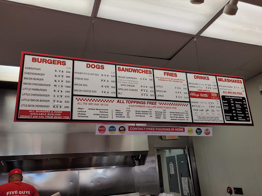 Typical 5 guys... Clean, great burgers and the free peanuts! Their burgers without a bun served in a tray are a great low carb meal. They also have one really cool multi-flavor coke machines.