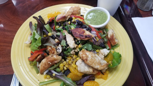 They make a delicious festa salad. Grilled chicken, baby greens, spinach, sweet roasted peppers, roasted corn, mandarine oranges, and tons of dried cranberries. =he cilantro dressing is tangy so not much is needed or the basalmic vinegarette is another choice but both really are delicious. I usually dont put much dressing because all of the flavors are so delicious that I can forget that its even a salad. They also give chips and salsa with the salad for $6.99 They have a salsa bar and for the folks who dont like spice they have a salsa that has none. Just tomatos and possibly onions, I dont remember. They have a few types of salsa which seem to be home made as well spicy pickeled carrots. My family has tried the wet burrito and one of the soups and said it was pretty good but I stick with the salad because its delicious. :)