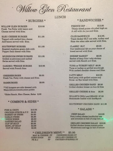 Oh my goodness we just finished a huge dinner at the Willow Glen. That place has the best ribs and pie to die for. If you ever are in the area you have to give yourself a treat and stop and eat there. If the mood strikes you the bar is a great place to kick back have a drink and play some pool !!!