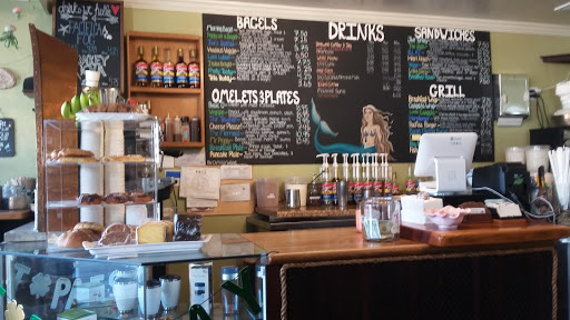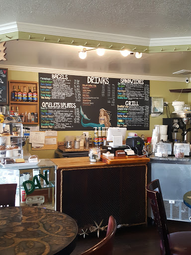 Cute small coffe shop they have breakfast & lunch sandwiches made fresh. Staff was happy & friendly considering there were several large groups inside. Patio is more spacious & you can hear & smell the ocean. Cute beach themed inside out and a friendly water bowl for your dogs.