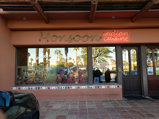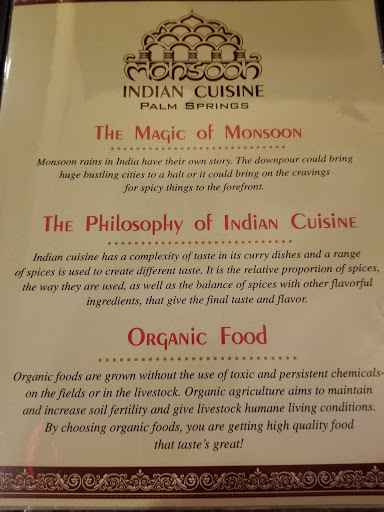 Monsoon Indian Cusine is nestled in the heart of palm springs on the southwest corner of Sunrise and Ramon. Once inside the somewhat bleak storefront, you will find a truly humble and warm atmosphere. The instant you walk through the door, the subtle redolance of curry is instantly intoxicating. Once seated, service is prompt and friendly. The staff is excellent in describing the fare and more than helpful in suggesting something to the weary. Once your meal arrives, your table will more than likely grow quiet, as you enjoy every last bite. Dessert is phenominal and the entire experience is sure to delight!