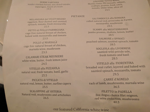Very Good Italian food- pastas, fish, meat, sauces are all well prepared. I am not a calamari fan, but my friends love it at Osteria. Food always arrives hot, seemingly within minutes of being done. Traditional Italian, but that does not mean just lasagna or basic pasta. Rather it means it is not chic-- plain white plates and no avant guard names for dishes. The side vegetables are seasonal and cooked perfectly, retaining their color.