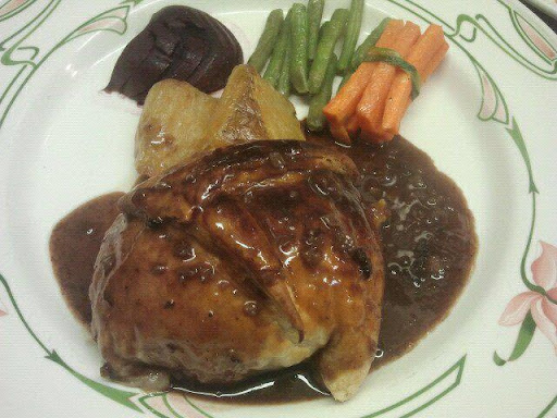 Atmosphere is traditional style and very comfortable. We had excellent dinners - one duck and the other shrimp and both were excellent. The food was skillfully cooked and artfully presented, and includes soup, garden salad and fresh bread with butter. Staff was very warm and friendly. All at a very reasonable price.