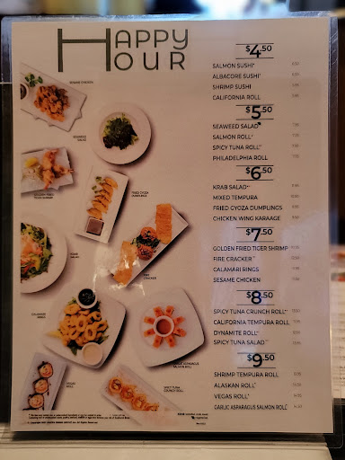 I love this place! Happy hour runs fro 3PM to 6Pm. They have a great selection of appetizers, rolls, salads and drinks on there happy hour menu. I suggest the asparagus garlic salmon roll. It is amazing! They also have a reverse happy hour at 9PM to 11PM. It is limited, but if you want a better price for sushi it is still a good find. Sometimes when you sit at the bar you get left out. They dont have a specified waiter for this area. You may or may not get service. Otherwise I absolutely love this place!