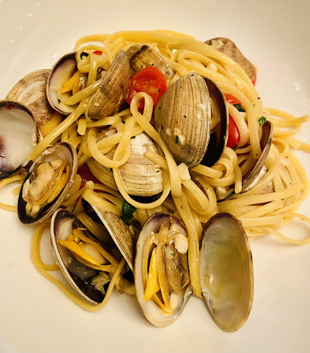 Mi Piace is a staple to Old Town Pasadena. I pass by often, and see people eating their lunch on the sidewalk. There are no lunch specials here. The interior is eerily white, as white as my marinara dotted white shirt (note - dont wear white). Looking around the patrons, I see the real housewives of Pasadena eating here, as well as other high-end shoppers. There wasnt a trace of the local lunch crowd here at all. So what am I doing here? Supposedly, Ive forgotten what a 25 dollar lunch tastes like. -=-Calamari e Gamberi FraDiavolo (Seafood Pasta)-=- Yes, its seafood so its going to be pricey. I didnt think it was 18 dollars worth of pasta though so do yourself a favor and dont get this. Usually pasta stuffs you, but even with all the complimentary bread, I still left unsatisfied. Calamari on my plate left much to be desired (quantity + taste), and the shrimps were a bit better, but ended fairly quickly. Marinara is probably the weakpoint here, so if you must pasta, get a white sauce. Happy Hour....all night on Monday. thats what this place is to me.