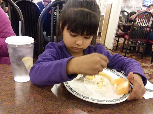 My daughter and I enjoy eating at the Dragon Palace King Buffet. My favorite is the Hot and Spicy shrimp with Shell and fried bananas. My daughters is the chicken on a stick, broccoli, white rice and ice cream.