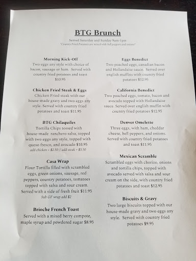 I really enjoy the fresh mixed greens with balsamic vinaigrette & chevre (in place of the Roquefort listed on the menu). The French chevre is very mild, and quite good, although with the wonderful local chevres in Sonoma, I wonder why theyre importing from France. There are plenty of local microbrews & wines. Specials, such as the Dirty Bird fried chicken sandwich are often very good. The Italian Sausage Sandwich with fresh grilled sweet red peppers & homemade dijon sauce should possibly be a controlled substance as I suspect it is addictive. If only it werent so, so messy. Burgers are big, tasty & messy as well. My least favorite thing about btg is the service. Waiters take your order and deliver it, but often disappear for 20 minutes or more after that. It can be challenging to flag anyone down for missing condiments or utensils or for additional requests or to check on missing food items. This seems to be the norm, even when the place isnt busy. Desserts are disappointing - the chocolate cake was hard, dense and unappetizing. Mixed drinks have been less than stellar - stick with the wonderful selection of local beer & wine. . . Ill go back for the salads, burgers & sandwiches, grilled salmon & ribeye.