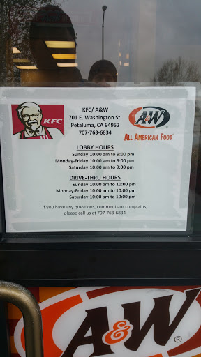 KFC is exactly what you would expect. The KFC in Petaluma also has an A&W Root Beer inside of it, thus quantifying the 4 star review. Service is on the slower side.