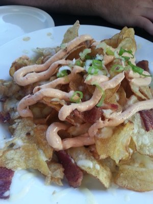 7/24/14 My husband and I stopped in and ordered the potato nachos. He wasnt very hungry so it was my choice. The $9 plate of chips, cheese, bacon, and spicy sour cream was a little disappointing. Before it arrived though, a swarm of flies surrounded our table and we had to keep batting them away. (No, they werent following us, they were just in the place all over.) One even rested on my water glass. It kind of freaked us out and we didnt even have our food. When the nachos did arrive, most disappointing (for husband) was that less than one piece of bacon was chopped onto our plate of chips. I know, because I had one little tiny piece of it, and Casey ate all the rest, and verified that there was almost none. He wasnt able to eat the chips with the spicy sour cream because it was too hot for him so he ate around those. I added Chipotle hot sauce and sriracha (yes, both!) to my plate, as well as some salt. My chips were crispy and very spicy. As we neared the end of the chips, there were so many left with no cheese at all. The housemade chips were very good, but at that price, I would expect more cheese, more bacon, and more care to the plate that youre serving customers. Make sure its consistent and appears well put together. Our server (Kinder) was excellent, and at one point I think a manager also helped us and even offered to "expedite" our payment upon seeing my credit card out, but we werent in any rush. Service was good all around. We would definitely come back to try something else or order a drink, but the potato nachos just werent a good value ($9.74).