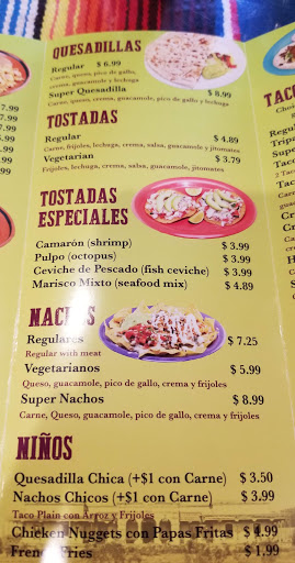 The food was no good at all. The pork in my burrito had squishy, greasy fat on it, and the entire time i ate the burrito i had to pick out the greasy fat like a slimy worm out of the burrito. My brother just aye a burrito and we didnt tell him we didnt like it and he only ate the top tip of it and he said "I dont know what it was but the meat tasted weird." Also the chips were awful, they were thin like a piece of paper. The bean dip was presented in a horrendous way looking like dog poop that got run-over by a monster truck, and felt like it was reheated multiple times and was extremely dry like dirt.The only thing i liked was the cheese,and obviously they did not make that, i want to thank whatever company made the cheese and pepsi also becuase they made the expirience less awful and disgusting. And the Orchata looked like a murky dark brown water like something u would get out of a river, it is supposed to look slightly clear. And the Shrimp Ceviche was mostly vegetables instead of shrimp which is what it is called: Shrimp Ceviche not Vegetable Ceviche! And for the finale the worst food wait i dont think u can call it food was the tacos, the moment u look at them u can tell they r awful. U bite into the tacos and it leaves a greasy residue on ur lips, it is so disgusting. I dont believe this restaurant could possibly have some people who think they should have a 4 star rating. I believe they need a lot of work, and the workers also should have a better attitude.