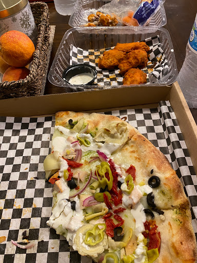 Pizza, spicy wings and drinks were awesome. The pizzas arrived on a tower one over the other. Thin crust and freshly out of the oven. Mediocre IPA beers but still a place. Everyone who works there is young and friendly.