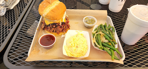 First time eating here. Five stars all around! Great service from the moment we walked in. Very laid back atmosphere with classic car decor, nice outdoor patio with heaters. They do have live music but we didnt have time to stay and enjoy it. THE FOOD,,,, ABSOLUTELY WONDERFUL! Hardy portions with great homemade flavor. The brisket sandwich was tender and juicy with the meat piled high! The people sitting next to us ranted and raved about the ribs. I will try those next time for sure. I highly recommend stopping in here for a bite to eat!