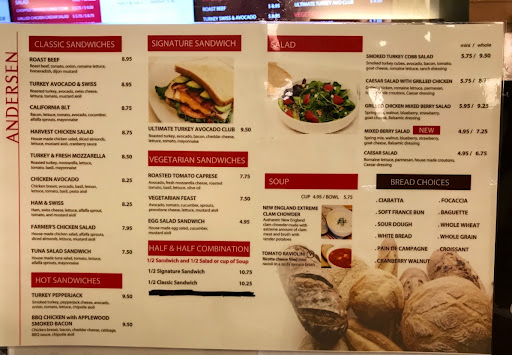 Whenever I have to take the ACE Train, I stop by Andersons to get a few of their loaves of bread. I usually get garlic, international, and the Pisano. These loaves have a cheese filling in them, and when toasted and sliced, are delicious! Unfortunately I wish I can say the same thing about their salad. I ordered the mini chicken fruit salad to go because I absolutely cannot miss my bus to the train station. If I miss it, then I miss my train, and the buses come hourly. So as Im now sitting here at the bus stop eating the salad, I realized that theres no dressing. Im not a big fan of leaves. But I force myself to eat salads because they are healthy. I looked through the bags they gave me to see if the dressing came separately. Nothing. I looked sifted through the leaves... Nothing. Im disappointed. Luckily it didnt taste too bad. The salad came with apples, mandarin oranges, grapes, and pecans. The fruit and pecans gave the salad flavor, but it wouldve been better with the sesame vinaigrette it advertised. I recommend their breads. But if youre getting a salad, dont get it to go. Dine in just in case theres a mistake.