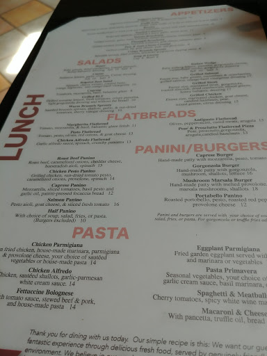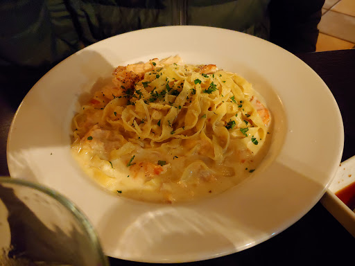 Went here for my anniversary dinner the other night. I was excited to try this place, but by the end I was disappointed. For the appetizer, we had coconut shrimp and some type of pesto garlic bread. For the entrees, I had chicken parm, and my husband had some type of shrimp pasta - nightly special. The only thing I enjoyed was the side of alfredo pasta - they do make their pastas from scratch, on site daily, which I could definitely tell. However, the chicken was awful. There was barely any cheese on top (see photos below), but worst of all, the chicken was really tough and even using a knife to cut it was difficult. The chicken also lacked flavor and only the breading part had some. For $20, its not worth it! When I saw the prices online, I imagined something more upscale than what I walked into. They have an extremely casual setting. The lighting is horrible! Theres no ceiling lights, only a couple of wall sconces on each side, which isnt nearly enough. For the prices they charge, I expected more. The service was alright, and we didnt have to wait long for the food, but there was also hardly anyone in there anyway. I can see why. If you decide to go, dont get the chicken parm - youll be disappointed. Overall, too expensive for such a casual setting, but if we do go back, Ill get the alfredo because that part was good.