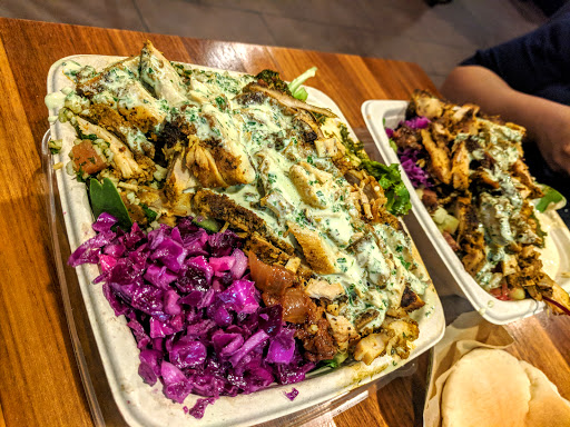 I tried this place on a whim. I ordered the half & half bowl. The staff were very nice. I asked what the green spicy sauce was and they immediately prepared a sample for me to try. Get it, its really flavorful and not too spicy. The eggplant was the best part. It is served cold and in a sweet red pepper sauce that makes it rich with a creamy texture. The chicken was tender but the falafel balls fell short. They were oddly crispy and course ground. The pitas come in an enclosed box, then you rip off the perforated top to use the box as a holder. The baklava was fresh and crispy just like it should be. The only downside is the service was a little slow; be prepared to be patient in line.