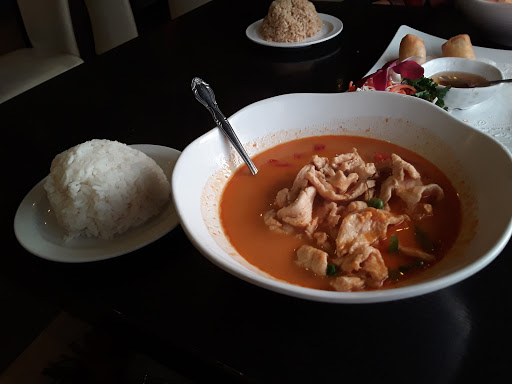 Ate here for the first time today and it exceeded my expectations! When you first enter Jasmine Thai you are greeted by a beautiful fountain wall which, with its beautiful bronze inlay, really sets the tone for your dining experience. This is a lovely restaurant with beautiful decor, really an upscale ambiance with very reasonable prices. From the walls to the table linens, Jasmine Thai sets the tone for a high quality dining experience with food that is as good as the atmosphere. I had the Yellow Curry with chicken and shrimp, while my wife had the honey, pepper and garlic with chicken and shrimp. What I really liked about Jasmine Thai was that the dishes were named/labeled by their spices and you just chose the meats. For example, my order on the menu just said "Yellow Curry" and at the bottom of the description of what spices were used was a list of meats for the dish... in this case, I went with chicken and shrimp as noted above The shrimp were nice and plump in both mine and my wifes dishes and the curry was spiced just right. Now, Ill qualify this statement with the fact that Ive never been to Thailand but curry of all kinds is my favorite dish so Ive eaten a lot of Thai curry and this is some of the best coconut milk based Thai curry Ive eaten. The sweet coconut milk in this curry was well balanced by the pepper flakes and other spices which produced a pleasing warmth. We also had an appetizer of chicken dumplings. They were delicious as well! Well be going back at night because this place looks like it will be delightful if dimly lit.