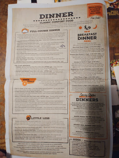 Im actually very disappointed. I saw the menu online, decided perhaps this would be better than Dennys across the street. Im a counter person; cant see using a table when its just me. Of course seating quickly is hardly a problem at the counter. It would seem all the servers take their breaks sitting at the counter 1 seat away from me. Of course that invites other servers and then its off and running. I get to sit and listen to all the problems of people not coming in, needing more sleep, yada yada yada. If I wanted to spend my evening with that, Id just stay a work myself. I think Ill go back over to Dennys. At least they dont care enough about you and leave you alone and they usually always pour the coffee when the cup is empty, or close to it anyway. I wrote this entire commentary and Im still waiting for a second cup of coffee after having the steak and shrimp dinner. $21.04 I pay to listen to the drama. Tsk tsk tsk, girls, air out your problems NOT at work. Gee theyre loud.