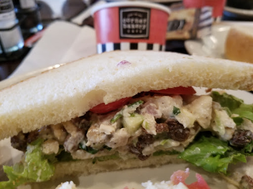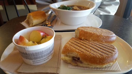 Quickie: + Tasty menu options and lots to pick from + Nice, standard chain restaurant decor + Big parking lot --- Food: I had a scrumptious grilled Reuben panini with their in-house bakery chips. They are very generous with the sauerkraut and despite being as hungry as I was, I still had one half to take home with me. The other dishes that were given two thumbs up by my coworkers were the: + Anaheim Scrambler + Tomato Mozarella on Ciabatta + Half-Moon All-Cheese Pasta (I had nibbles of this and basked in its yumminess, as well) Their dessert display is also very tempting. I gobbled up a cinnamon pecan rugalach and it was BOMB. The thought of its flaky goodness makes me want to go back, buy a bag and eat them all up by myself. Verdict: All in all, my first time was very pleasant - the location is very nice too. It shares a center with a huge CVS and Handels. Great place to grab lunch, run your errands and take a massive ice cream cone back to the office.