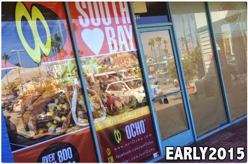 I recently visited this Redondo Beach location after some time that it had been on my radar of new places to try. Located on a shopping center, you have a whole lot of parking available at any time of the day, the restaurant itself has a very nice outdoor eating area with tables and umbrellas to enjoy the sun and nice fresh air. I notice there was a few people sitting there enjoying their meals and had their dog with them, so you can definitely bring your dog along too if you like. Walking in to the restaurant, you see a very modern and colorful decorations all around, with a walkway to direct you to the food area where a very friendly staff member greats you and asks what you would like to have. Since it was my first time visiting, I asked what was recommended. The gentleman suggested the seasonal duck tacos or the chimichanga. I when with 3 tacos with duck meat, braised with Asian and Mexican spices, I topped it off with Jicama, Mango, Cilantro and Onions. There was few other toppings they suggest to go with the duck, like siracha mole sauce and cucumbers although I skipped on those. I absolutely enjoyed the duck! The combination of toppings and the flavor of the meat was perfect and delicious! I would suggest to keep the duck and not only have it seasonal. The staff was very helpful and friendly to take the time to tells us about items and menu question we had. very helpful when it was our first time and get some guidance on what to pick. The room was very well decorated with tones of red and small cactus on the tables that made a nice accent. Near the soda fountain there was some more decorative plants hanging that made for nice look. Overall i highly recommend you guys try Ocho and their many menu items. Ask for what is been served that is seasonal and make a choice of what to pick based on what you are in the mood for and whats new and available.