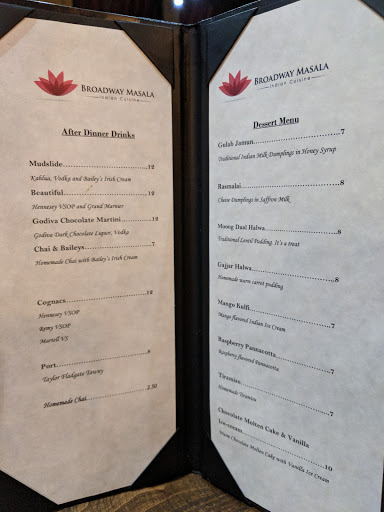 Really wanted to like this place since Suraj closed and there is a lack of Indian food in the area. FIRST WARNING! EVERYTHING IS A LA CARTE so super PRICEY SECOND WARNING! The food sucked! Seriously. I asked for Tikki Masala and a woman told me it was the Butter Chicken. NOT! I also ordered shrimp wrapped in bacon because it sounded so good, it was so-so. Top it off with a little rice and some nan and Im out the door spending $46 ARE YOU KIDDING?! Butter Chicken = very thin sauce covering cubes of dry, hard, yucky chicken. Shrimp was also over-cooked and hard to swallow. Im sorry Broadway Masala, but I will NEVER return.