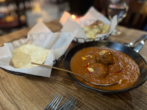 Broadway Masala is a one of my new favorite Indian Restaurants in the Bay Area. My boyfriend and I stumbled upon it on our way to eat at New Kapadokia and decided to dine here instead. For appetizers, we ordered the Puchka Chaat which was just ok. The stuffed Naan caught our eye and our waiter recommended the Naan with Bacon or mushrooms. We couldnt resist the bacon! Ive never seen this combo before but it was delicious. We were starving so we asked for this as an appetizer and planned to eat the rest with our meal. Unfortunately, we couldnt control our appetites and all the Naan disappeared before our entrees were served. For our entrees we shared the Scallop and Shrimp Moilee-- a great seafood dish with sweet coconut sauce--- and the Chooze Makhni (butter chicken), plus a basmati rice. This was way too much food for two people (no room for dessert!) and we brought the leftovers home. The restaurant has a very nice ambiance and atmosphere. I love their keg decorations, lighting, and different paintings. The waiters were very friendly, attentive, and knowledgeable about the menu. Ill definitely be returning!