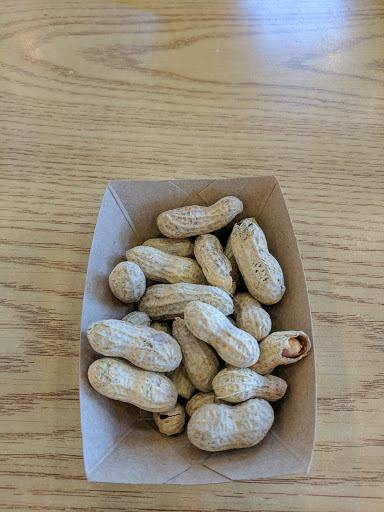 Good burgers with great toppings (at no, or little extra cost) and great fries. Dining in or out? Both served wrapped in foil in a paper bag. Peanuts for snacking in the meantime.