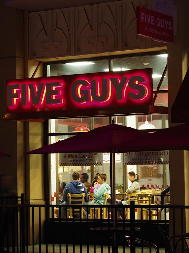 Fun place for a five guys down town with plenty of out door seating and other attractions.