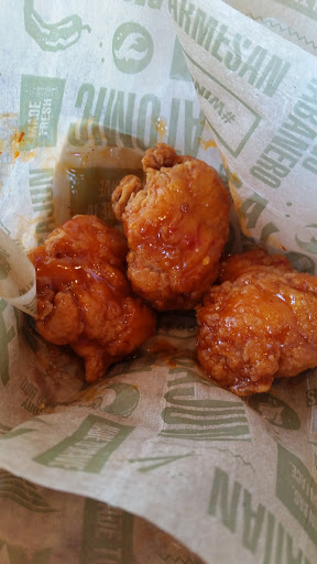People do not waste your time with this restaurant Im usually not the particular person to discredit a restaurant or leave negative reviews but this calls for it. My husband and I its our first time to this particular wing stop we waited in line for about 15 mins the cashier has really poor customer service skills not once did she look up and acknowledge that we were standing in line. I guess that call was that damn important. Not only did we wait this obscene amount to of time to order the food quality is very poor. How could you over cook boneless wings. The wing were very dry and really crunchy. The garlic parmesan was a waist of my money they over cooked the wings and drenched the wings in store bought Parmesan cheese. The fries were old and nasty. Stay away from this wing stop people.
