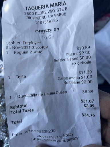 my favorite food in Taqueria Maria is Bistec Ranchero, Super Burrito pollo Asado.