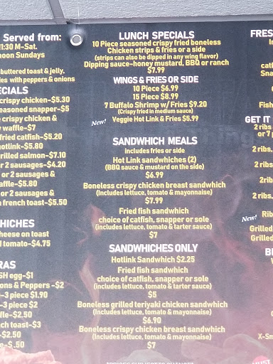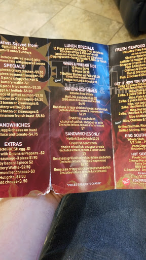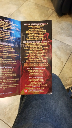 Staff was nice ,but service was awful .Waited 1 1/2 hours to get my order, the place was really dirty when I looked in the kitchen when the door opened I could see it , the girls in front kept leaving to the back and coming back to the front chewing food and drinking soda ,the clothes too small and not professional looking. One of the guys came to the front wearing a black trash bag on his body (weird ) the microwave broke , other customers were getting really mad cause they called in there order and still had to wait an hour . I kept hearing the phone ring but no one answered it .. The longer I waited , the worse things got .We got our food got home ate and the fish smelled to fishy it was snapper , but I ate most of it Anyways since I waited so long, well I got really sick vomited after , I got food poisoning ugh .. the fries were soggy and way too much salt the wings were also salty , but tasted okay. They were out of ribs and Mac and cheese , and peach cobbler the worst experience I have ever had , and this was my first time going there . And there is a big sign says No refunds if you walk out of restaurant, I wonder why