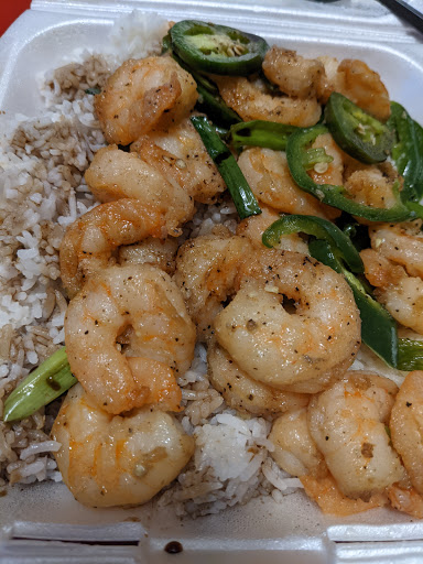 Huge portions. Fresh items (not chewy like other places). No brown rice (only white or fried). The two restrooms are single (not shared and relatively clean